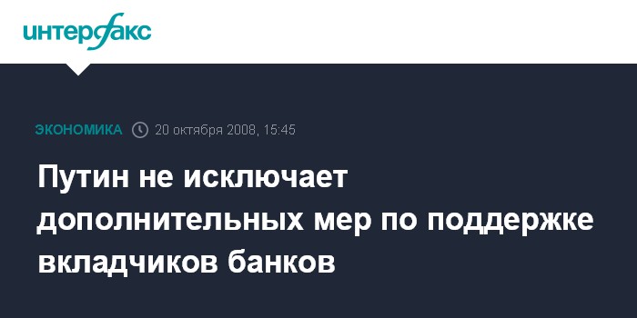 Москва. 20 октября. INTERFAX.RU – Правительство РФ может рассмотреть дополнительные меры по поддержке вкладчиков российских банков, заявил в понедельник премьер-министр РФ Владимир Путин на заседании консультативного совета по иностранным инвестициям.