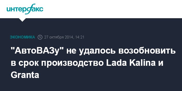 Москва. 27 октября. INTERFAX.RU - "АвтоВАЗ" не возобновил в срок производство Lada Kalina и Lada Granta, приостановленное ранее из-за отсутствия необходимых компонентов, сообщил "Интерфаксу" источник, знакомый с ситуацией.