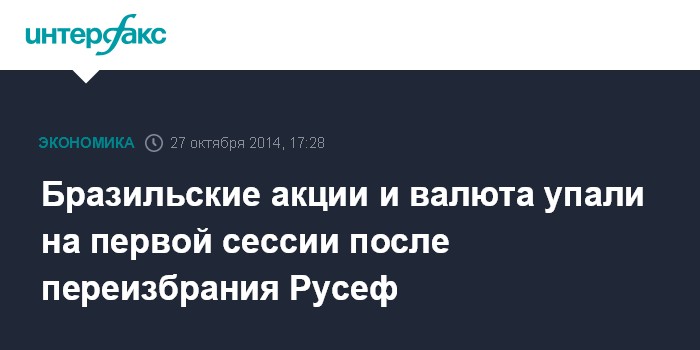 Москва. 27 октября. INTERFAX.RU - Рынок акций Бразилии падает в понедельник вслед за курсом национальной валюты на результатах второго тура выборов президента страны, в котором победила действующая глава государства Дилма Русеф, сообщает MarketWatch.