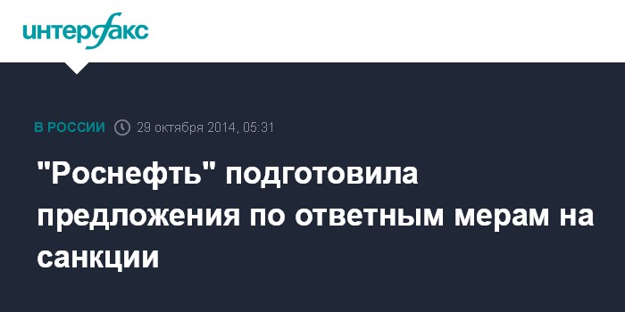 Москва. 29 октября. INTERFAX.RU - "Роснефть" подготовила перечень мер господдержки реального сектора экономики и ответных мер против стран, которые ввели антироссийские секторальные санкции, пишет газета "Коммерсант" со ссылкой на нескольких федеральных чиновников, знакомых с ситуацией.