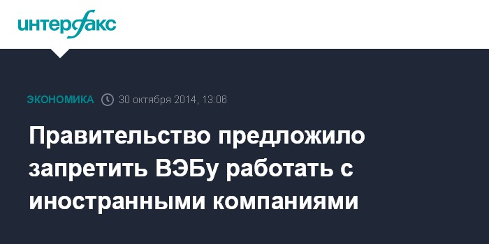 Москва. 30 октября. INTERFAX.RU – Правительство России считает целесообразным ограничить работу ВЭБа с иностранными компаниями по всем видам деятельности, а не только запретить ему финансировать инфраструктурные и инновационные проекты через кредитование иностранных компаний. Соответствующий запрет предлагают ввести сенаторы.