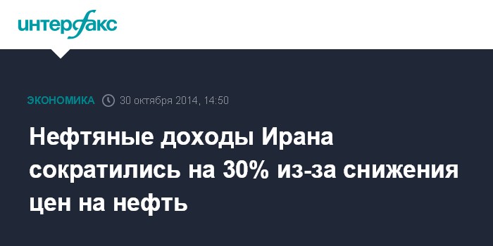 Москва. 30 октября. INTERFAX.RU - Выручка Ирана от продажи нефти, являющейся главной статьей его экспорта, сократилась на 30% из-за недавнего падения цен на нефть, заявил президент страны Хасан Рухани.