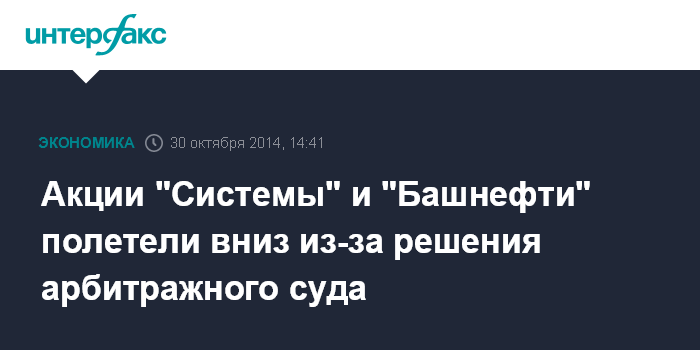 Москва. 30 октября. INTERFAX.RU - Акции АФК "Система" и "Башнефти" днем в четверг полетели вниз после известий о решении Арбитражного суда Москвы вернуть акции "Башнефти" государству.
