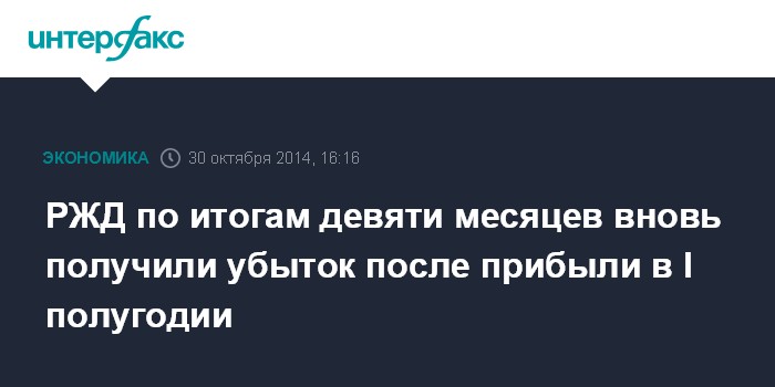 Москва. 30 октября. INTERFAX.RU - РЖД по итогам 9 месяцев 2014 года вновь получили чистый убыток по РСБУ после прибыльных результатов I полугодия, следует из отчетности компании.