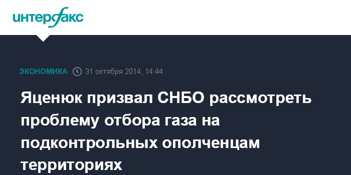 Москва. 31 октября. INTERFAX.RU - Премьер-министр Украины Арсений Яцкенюк просит Совет национальной безопасности и обороны рассмотреть проблему безоплатного отбора энергоносителей на территориях, находящихся под контролем сил ополчения Донбасса.