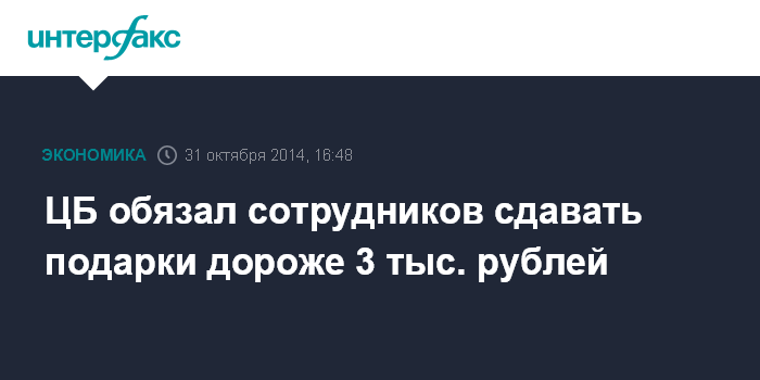 Москва. 31 октября. INTERFAX.RU - Банк России обязал своих сотрудников сдавать подарки, полученные в связи с их должностным положением, если стоимость подарка превышает 3 тыс. рублей. Соответствующее положение N438-П опубликовано в "Вестнике Банка России" в пятницу и вступило в силу со дня опубликования.