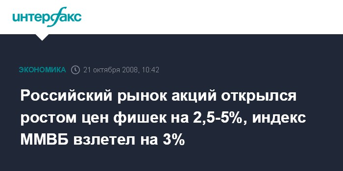 Москва. 21 октября. INTERFAX.RU - Российский рынок акций открылся во вторник ростом фишек на 2,5-5%, индекс ММВБ взлетел на 3% вслед за подъемом мировых фондовых площадок и нефти.