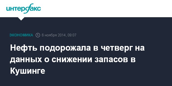 Москва. 6 ноября. INTERFAX.RU - Нефть WTI дорожает в четверг на данных о снижении запасов на терминале в Кушинге, штат Оклахома, где хранятся физические объемы нефти, торгуемой на NYMEX, сообщает агентство Bloomberg.