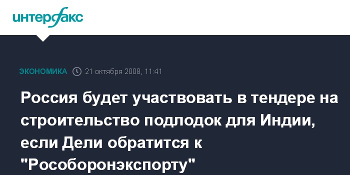 Москва. 21 октября. INTERFAX.RU - Россия готова принять участие в тендере на строительство для Индии шести подводных лодок, заявил журналистам во вторник первый замгендиректора ФГУП "Рособоронэкспорт" Иван Гончаренко.