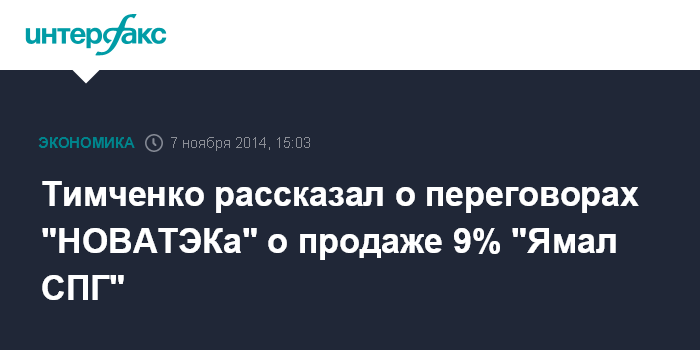 Москва. 7 ноября. INTERFAX.RU - "НОВАТЭК" ведет переговоры с китайскими и индийскими компаниями о продаже до 9% в проекте "Ямал СПГ", сообщил "Интерфаксу" мажоритарный акционер "НОВАТЭКа" Геннадий Тимченко.
