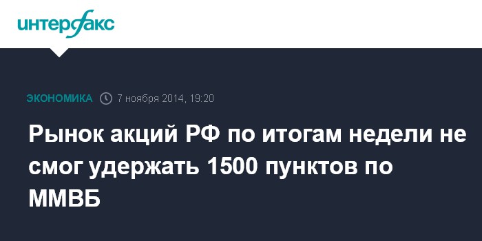 Москва. 7 ноября. INTERFAX.RU - Российский рынок акций по итогам недели не смог удержать протестированный рубеж 1500 пунктов по индексу ММВБ из-за укрепления рубля в пятницу после заявления Банка России о готовности совершать валютные интервенции для поддержания нацвалюты.