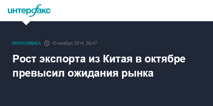 Москва. 10 ноября. INTERFAX.RU - Объем китайского экспорта в октябре 2014 года увеличился на 11,6% относительно того же месяца прошлого года после максимального за 1,5 года скачка в сентябре на 15,3%, свидетельствуют данные таможенного управления КНР.