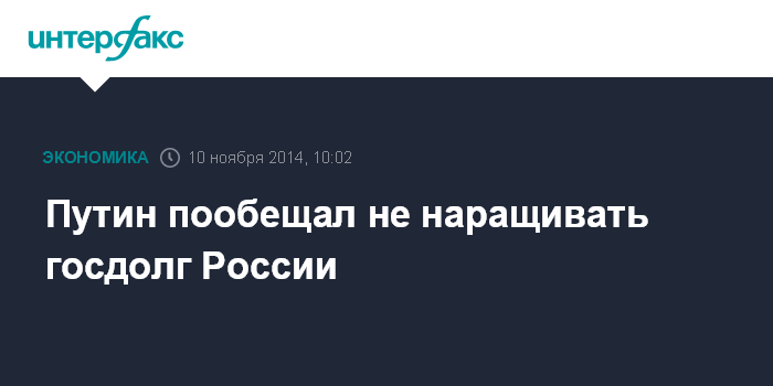"Наращивание госдолга не будет. Планируем удерживать его на безопасном, контролируемом уровне - менее 15% ВВП", - сказал Путин, выступая на деловом саммите АТЭС.