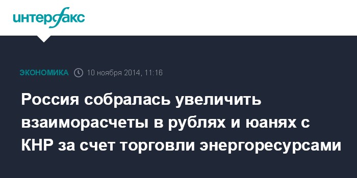 Москва. 10 ноября. INTERFAX.RU - Россия намерена более активно использовать в рамках экономических отношений с Китаем расчеты в национальных валютах, будет расширять такие возможности за счет торговли энергоресурсами, заявил президент РФ Владимир Путин.