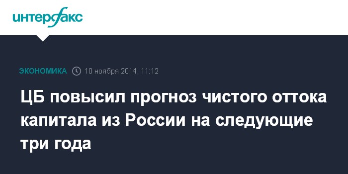 Москва. 10 ноября. INTERFAX.RU – Банк России повысил свою оценку чистого оттока капитала из России в 2014 году до $128 млрд с $90 млрд, ожидавшихся им в этом году ранее. Такая оценка содержится в обновленной версии проекта основных направлений единой государственной денежно-кредитной политики на следующие три года.