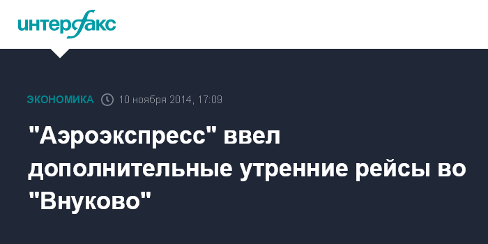 Москва. 10 ноября. INTERFAX.RU - Два дополнительных утренних рейса вводятся с 13 ноября на участке Киевский вокзал - аэропорт "Внуково", сообщается в релизе компании "Аэроэкспресс".