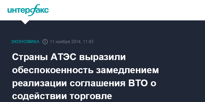 Москва. 11 ноября. INTERFAX.RU - Страны-члены Азиатско-Тихоокеанского экономического сотрудничества выразили обеспокоенность замедлением реализации соглашения ВТО о содействии торговле.
