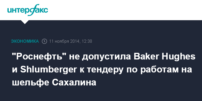 Москва. 11 ноября. INTERFAX.RU - "Роснефть" отказала американской нефтесервисной корпорации Baker Hughes и международной Shlumberger в допуске к тендеру на геофизические исследования и сопровождение наклонно-направленного бурения двух скважин на шельфе Сахалина.