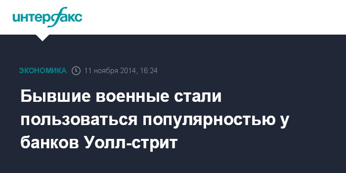 Москва. 11 ноября. INTERFAX.RU – Крупнейшие банки Уолл-стрит с готовностью принимают на работу бывших военных, рассчитывая на такие качества, ассоциирующиеся с военной службой, как стремление к лидерству, умение работать в команде и эффективно решать конкретные задачи, пишет Financial Times.