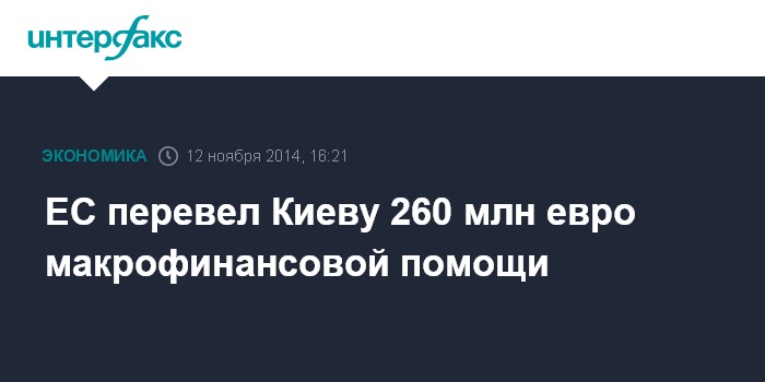 Москва. 12 ноября. INTERFAX.RU - Европейская комиссия перевела в среду Украине 260 млн евро макрофинансовой помощи, сообщается в коммюнике комиссии.
