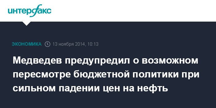 "Только сильное и длительное падение цен на нефть может потребовать пересмотра бюджетной политики. Но это должно быть действительно сильное и продолжительное падение. Эти флуктуации - 79-81-85 долларов за баррель - это пока конечно не о том. Но если падение будет продолжительным и оно будет серьезным, нам придется принимать определенные решения. Так все страны поступают и так поступили мы в 2008 году после того, как продолжилось более трагичное падение цен на нефть. Мы должны быть реалистами", - сказал Медведев.
