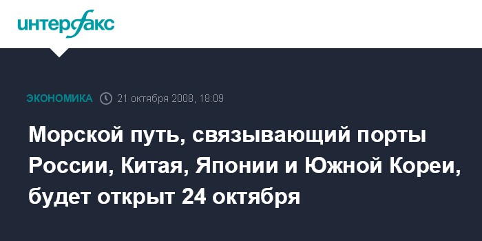 Москва. 21 октября. INTERFAX.RU - Первый совместный линейный морской маршрут между Россией, Китаем, Японией и Южной Кореей будет открыт 24 октября, сообщают китайские СМИ.
