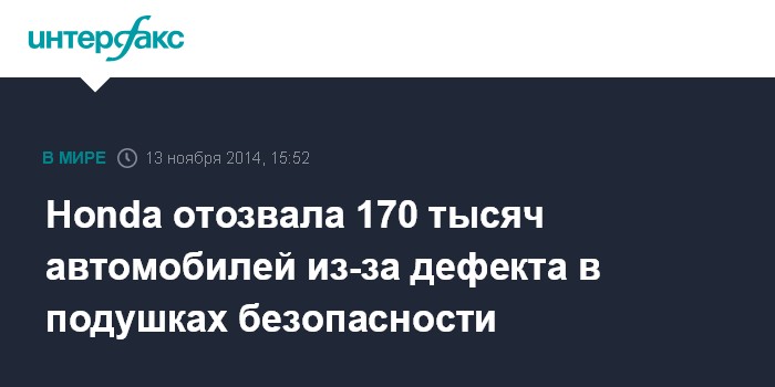 Москва. 13 ноября. INTERFAX.RU - Honda Motor Co. отозвала 170 тысяч автомобилей для замены подушек безопасности производства компании Takata Corp. после новости о еще одном фатальном инциденте в Малайзии, сообщает агентство Bloomberg.