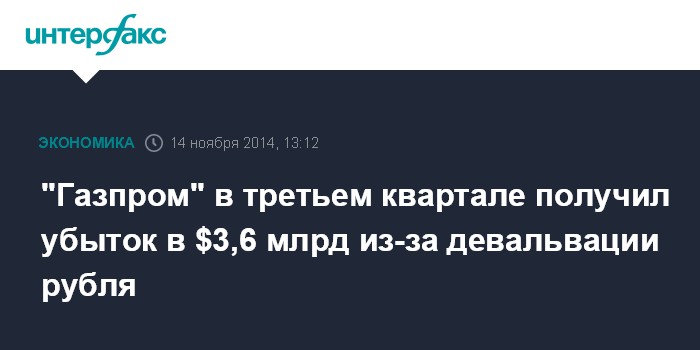Москва. 14 ноября. INTERFAX.RU - Переоценка валютного долга в результате девальвации рубля привела к "бумажному" убытку по головной компании "Газпрома" в III квартале 2014 года в размере 119,196 млрд рублей ($3,6 млрд) против чистой прибыли в 216,493 млрд рублей за июль-сентябрь 2013 года, сообщается в отчете компании.