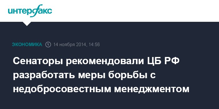 Москва. 14 ноября. INTERFAX.RU - В Совете Федерации предлагают Центробанку разработать меры, которые оперативно позволят отстранять недобросовестный банковский менеджмент от работы.