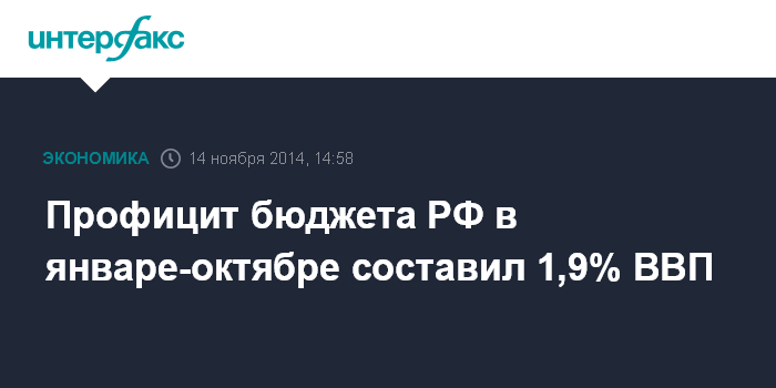 Москва. 14 ноября. INTERFAX.RU - Федеральный бюджет РФ в январе-октябре 2014 года исполнен с профицитом в размере 1 трлн 126,6 млрд рублей, или 1,9% ВВП, сообщила журналистам первый замминистра финансов РФ Татьяна Нестеренко со ссылкой на предварительные данные об исполнении бюджета.