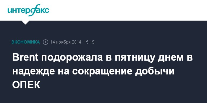 Москва. 14 ноября. INTERFAX.RU – Нефть марки Brent дорожает в ходе торгов в пятницу на ожиданиях, что снижение котировок ниже $80 за баррель повышает шансы на то, что Организация стран-экспортеров нефти уменьшит квоту на добычу на предстоящем заседании, сообщает агентство Bloomberg.
