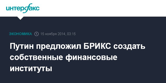 "Успешно выполняются решения по созданию в БРИКС собственных финансовых институтов, завершается формирование учрежденных на саммите в Форталезе Банка развития и пула условных валютных резервов", - сказал Путин, выступая в субботу на встрече лидеров государств БРИКС, которая прошла на полях саммита "двадцатки" в австралийском Брисбене.