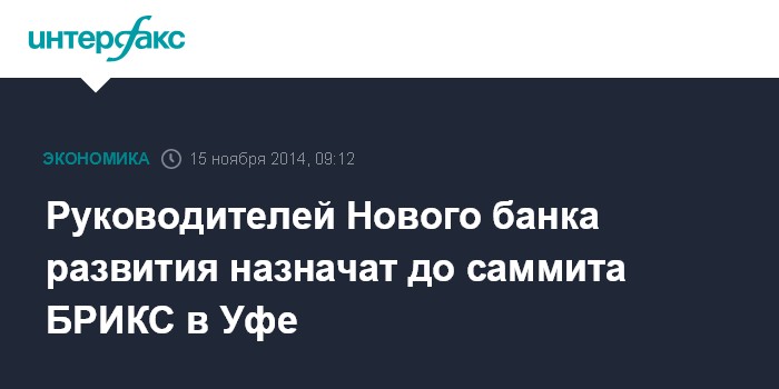 Москва. 15 ноября. INTERFAX.RU - Лидеры стран БРИКС поручили министрам финансов назначить председателя Нового банка развития и его заместителей до следующего саммита БРИКС в России.