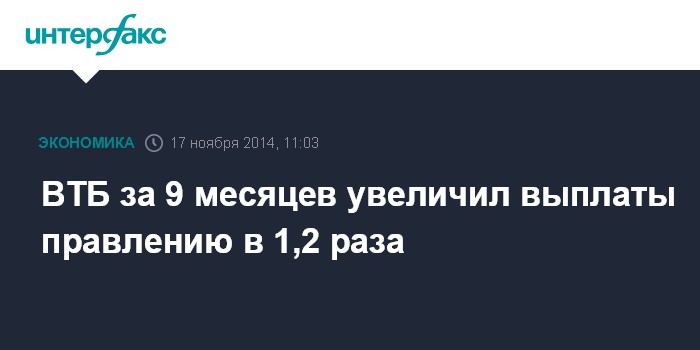 Москва. 17 ноября. INTERFAX.RU - ВТБ, второй по активам российский банк, за три квартала 2014 года увеличил вознаграждение правлению в 1,2 раза - до 1,42 млрд рублей с 1,18 млрд рублей за январь-сентябрь прошлого года, следует из ежеквартального отчета ВТБ.