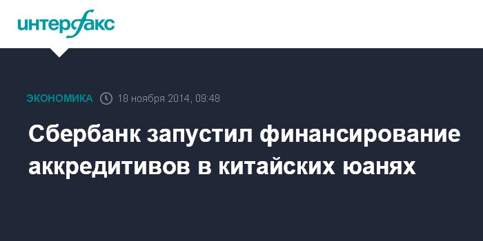 Москва. 18 ноября. INTERFAX.RU – Сбербанк России запустил новый продукт - финансирование аккредитивов в китайских юанях. На такой шаг Сбербанк пошел первым из российских банков, отмечается в пресс-релизе кредитной организации.