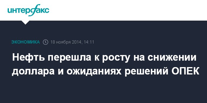 Москва. 18 ноября. INTERFAX.RU – Цены на нефть перешли от падения к росту в ходе торгов во вторник на фоне ослабления курса доллара и небольших изменений в ожиданиях относительно ноябрьского заседания Организации стран-экспортеров нефти (ОПЕК), сообщает агентство Bloomberg.