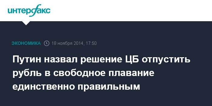 Москва. 18 ноября. INTERFAX.RU - Решение Центробанка РФ отпустить рубль в свободное плавание стало единственно правильным в нынешней ситуации, считает президент РФ Владимир Путин.