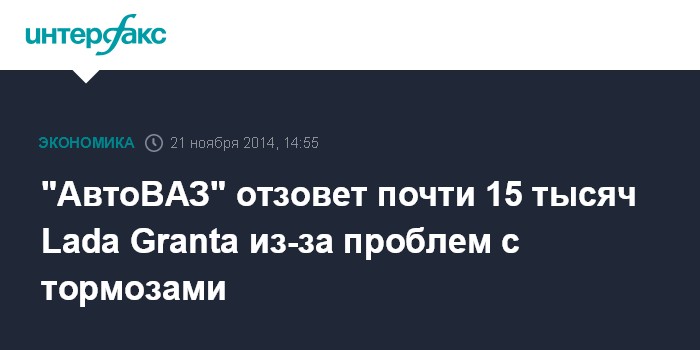 Москва. 21 ноября. INTERFAX.RU - ОАО "АвтоВАЗ" (MOEX: AVAZ) отзывает 14 тысяч 659 автомобилей Lada Granta в комплектации с ABS, реализованных с апреля 2014 года по настоящее время, говорится в сообщении Росстандарта.