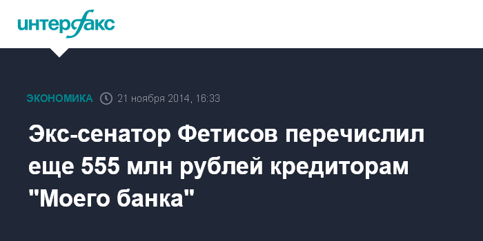 Москва. 21 ноября. INTERFAX.RU - Экс-сенатор Глеб Фетисов, обвиняемый в мошенничестве, перечислил 555,2 млн рублей в рамках процедуры погашения обязательств перед кредиторами обанкротившегося "Моего банка", сообщил "Интерфаксу" пресс-секретарь бизнесмена Игорь Пылаев.