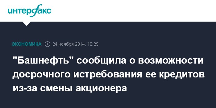 Москва. 24 ноября. INTERFAX.RU – Часть кредитов и займов "Башнефти" может быть истребована досрочно в связи с нарушением ковенант из-за смены контролирующего акционера, говорится в отчете компании по МСФО.