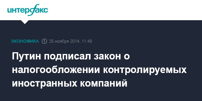 Москва. 25 ноября. INTERFAX.RU - Президент РФ Владимир Путин во вторник подписал закон, определяющий механизм налогообложения прибыли контролируемых иностранных компаний (КИК) и доходов иностранных организаций. Документ размещен на портале правовой информации.