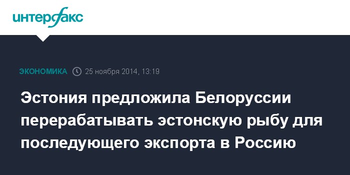 Москва. 25 ноября. INTERFAX.RU - Эстония предлагает Белоруссии перерабатывать эстонскую рыбу для последующего экспорта в Россию, заявил представитель союза рыбаков Эстонии Михкель Ундрест журналистам во вторник в Минске.
