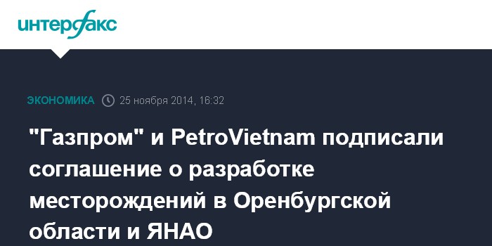 Москва. 25 ноября. INTERFAX.RU - Глава "Газпрома" Алексей Миллер и и.о. гендиректора корпорации нефти и газа PetroVietnam Нгуен Суан Шон подписали соглашение, касающееся разработки газоконденсатных месторождений в Оренбургской области и Ямало-Ненецком автономном округе.