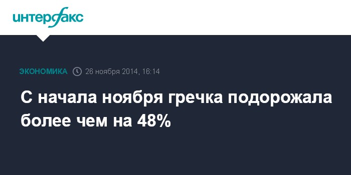 Москва. 26 ноября. INTERFAX.RU – Рост цен на гречневую крупу в России на минувшей неделе ускорился до 16,3% с 16,1% неделей ранее, сообщил Росстат в среду. С начала месяца гречневая крупа-ядрица подорожала на 48,3%.
