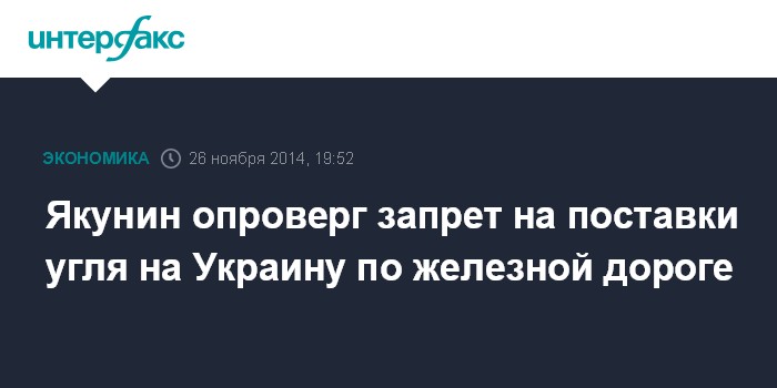 Москва. 26 ноября. INTERFAX.RU - Запрета на поставки угля на Украину по железной дороге нет, заявил президент ОАО "Российские железные дороги" (РЖД) Владимир Якунин журналистам в среду.