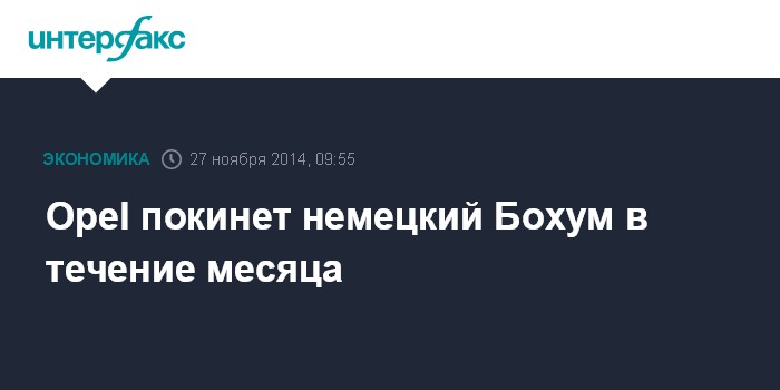 Москва. 27 ноября. INTERFAX.RU - Германский автопроизводитель Adam Opel GmbH, подконтрольный американской General Motors, закроет завод по сборке продукции в немецком городе Бохуме до конца 2014 года, передает Deutsche Welle.