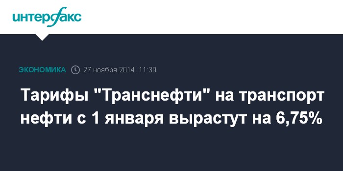 Москва. 27 ноября. INTERFAX.RU - Тарифы "Транснефти" на транспортировку нефти по магистральным нефтепроводам вырастут с 1 января 2015 года в среднем на 6,75%. Соответствующее решение приняла в четверг Федеральная служба по тарифам, сообщили "Интерфаксу" в ведомстве.