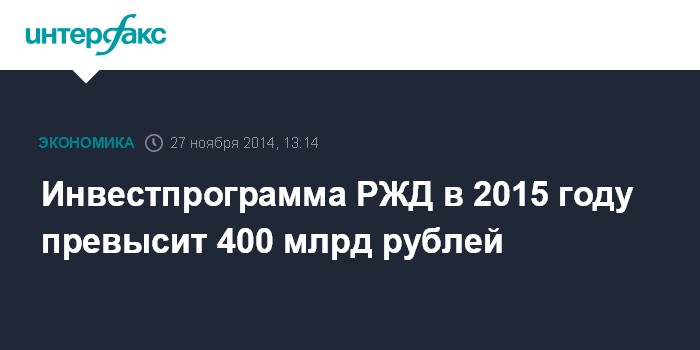 Москва. 27 ноября. INTERFAX.RU - Инвестиционная программа РЖД на 2015 год превысит 400 млрд рублей, сообщил на заседании правительства в четверг премьер-министр РФ Дмитрий Медведев.