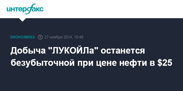 Москва. 27 ноября. INTERFAX.RU - Цена нефти, при которой добыча нефти для "ЛУКОЙЛа" безубыточна, $25 за баррель, заявил вице-президент НК Леонид Федун в ходе телеконференции.