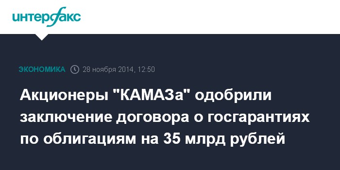 Москва. 28 ноября. INTERFAX.RU – Внеочередное собрание акционеров "КАМАЗа" одобрило заключение договора о предоставлении госгарантий по выпускам облигаций на сумму 35 млрд руб. между Минфином, ВЭБом и компанией.